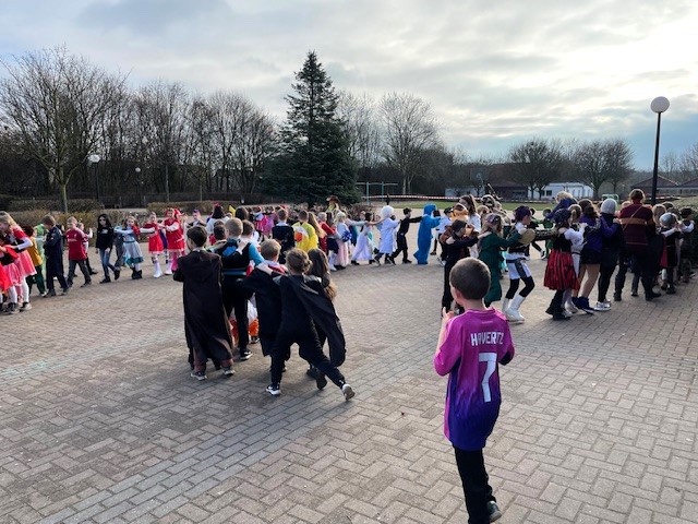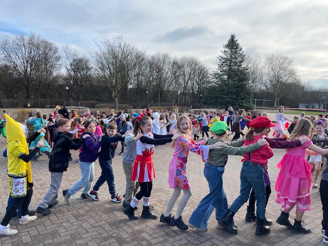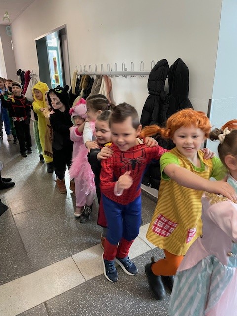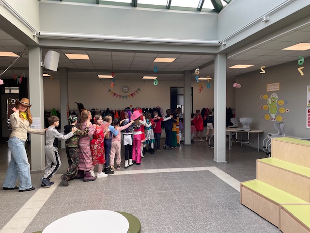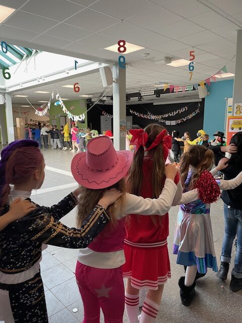 Am Freitag feierten wir in unserer Schule Karneval. Einhörner, Hexen und Zauberer, Polizist:innen, Tiger und Marienkäfer vernaschten dabei kunterbunte Buffets aus gesunden Speisen und besonderen Leckereien, tanzten fröhlich zu lauter Musik und trafen sich zu einer fast endlosen Polonaise durch die ganze Schule. Zuvor hatten alle Klassen ihre Räume festlich geschmückt und vielfach wurde im Kunstunterricht jahreszeitlich gebastelt. Das war ein ausgelassener Tag voller Lachen und Spaß.