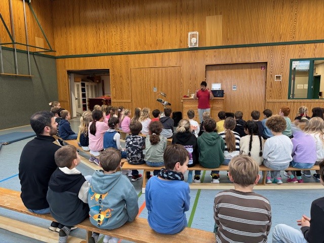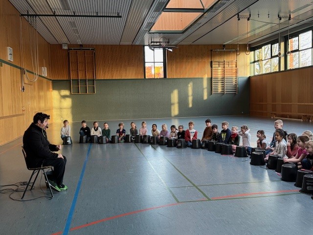 Der Profischlagzeuger und Musiklehrer brachte unseren Schülerinnen und Schülern die lateinamerikanischen Klänge seiner Heimat, Buenos Aires, näher. Er nahm uns mit in seine Kindheit in Argentinien, in der ihm ein teures Schlagzeug nicht zur Verfügung stand, er seinem großen Wunsch, das Instrument zu erlernen, aber mit großer Kreativität begegnete und kurzerhand Töpfe, Schneebesen, Schüsseln und Kochlöffel zu einem besonderen Schlagzeug umfunktionierte.